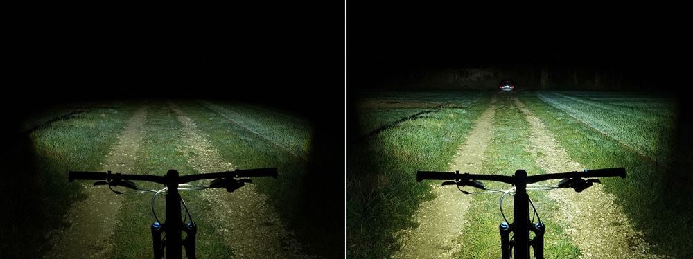 Światła drogowe o mocy 1300 lumenów SL F to nie tylko mocniejsze światła mijania. Za naciśnięciem przycisku cały wzór światła zmienia się i oświetla dodatkowy obszar, znacznie powyżej nieoślepiającej linii światło/ciemność: idealne do szybkich przejażdżek i wymagających szlaków.