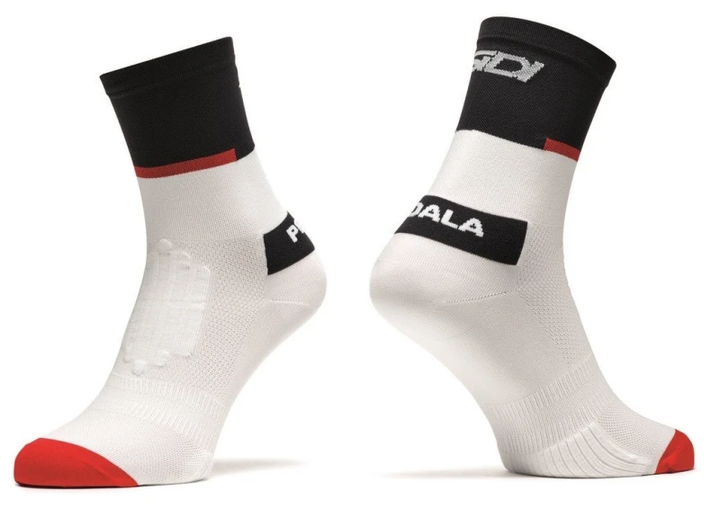 Skarpetki kolarskie wykonane z materiału Q-Skin i elastanu. Specjalny proces dodawania jonów srebra do przędzy poliamidowej przy produkcji pozwala na uzyskanie materiału charakteryzującego się wysokimi właściwościami antybakteryjnymi. Wysokość mankietu 18 cm.
